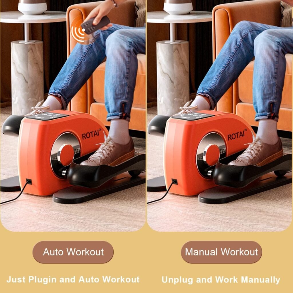 Made for low-impact daily activity, the ROTAI under-desk trainer helps maintain leg strength and flexibility without strain. Automatic pedaling takes over the effort, supporting circulation for users with reduced mobility or long sitting hours. Non-slip textured pedals gently stimulate feet, while the compact design fits easily under a desk or beside a chair. A simple remote lets you adjust speed and direction without bending, and the display shows time, distance, and calories for effortless tracking.